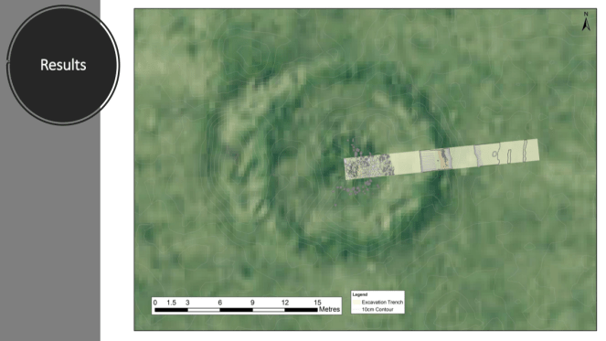 One trench, (18m x 2m), was opened on the eastern side of the monument where the banks and ditches are best preserved. The trench captured a portion of the central area, and sections of the three ditches and two banks. The outermost enclosing elements were previously only visible in earth resistance survey carried out by myself and IT Sligo students in 2016.