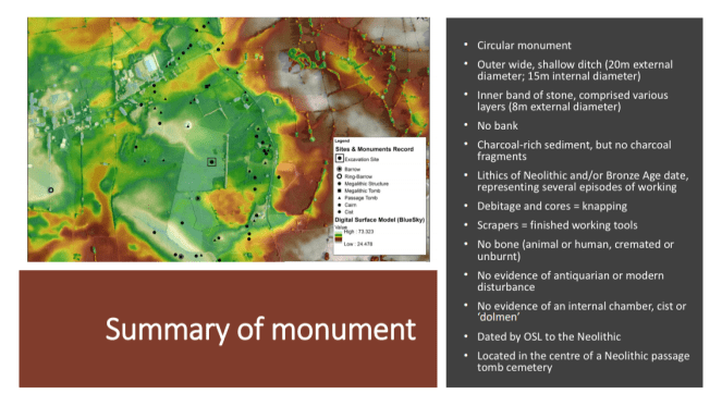 Outcomes: The excavation concluded after two weeks and the research has moved in to the post-excavation phase. An OSL-derived Middle Neolithic date for the monument indicates that it is contemporary with the Carrowmore cemetery complex.