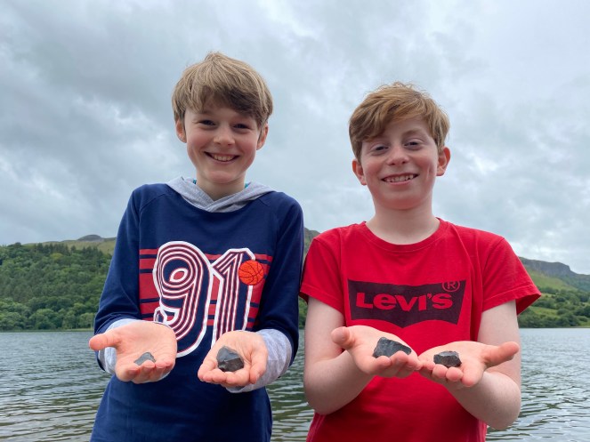 Image 4: (l-r) Yann McGuinness and Fiachra Dowd hold four of the stone tools they discovered whilst picnicking at Glencar Lake.