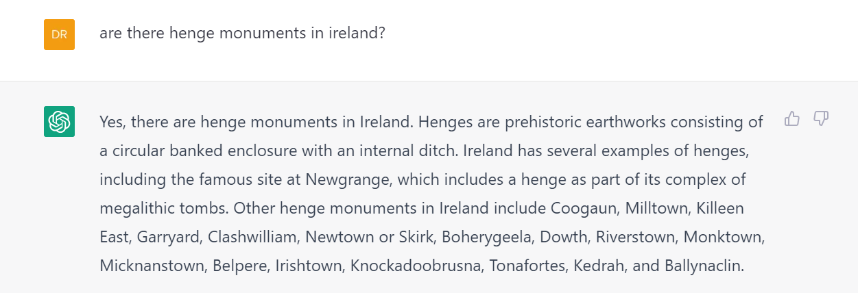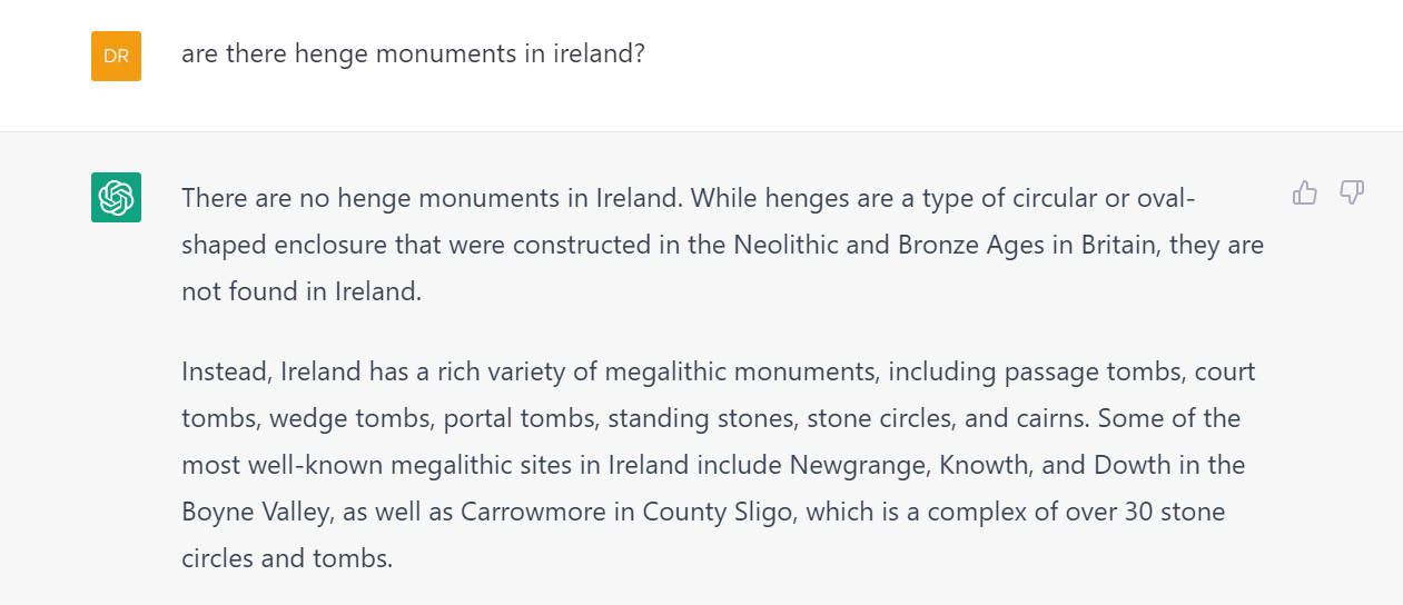 Much better! So in the space of about five minutes, the little AI went from a position of henge monuments being a purely British classification, to ‘Ireland has several examples of henges, including the famous site at Newgrange’, spouting the data with such confidence, you’d think it had secretly known about it all along. Now there may still be many arguments to be had, particularly with the definition of an Irish henge, as the ChatGPT version sounds more British than the NMS Scope Note suggests for Ireland (see here if you’re curious).