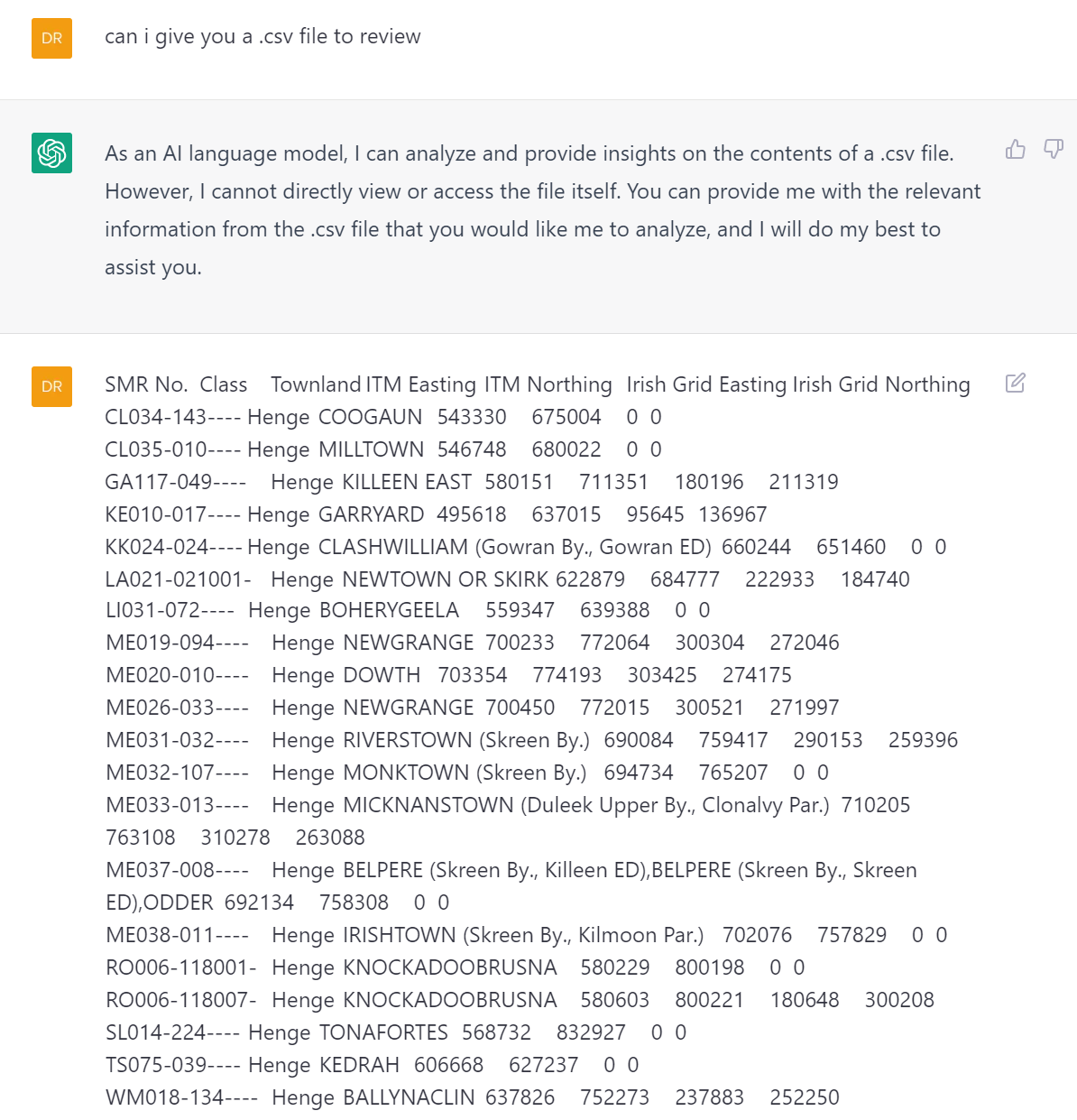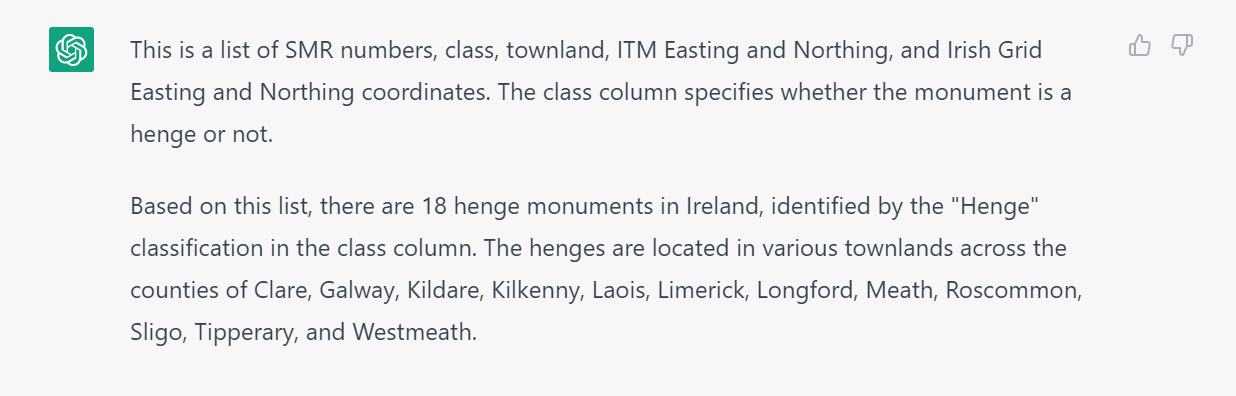 Learning how ChatGPT worked, I found that I can’t get it to review a website or give it a .csv file, but I can paste data into the chat box. So I clicked ‘Copy Results’ on the Historic Environment Viewer’s henge query and then pasted that table back in to ChatGPT.