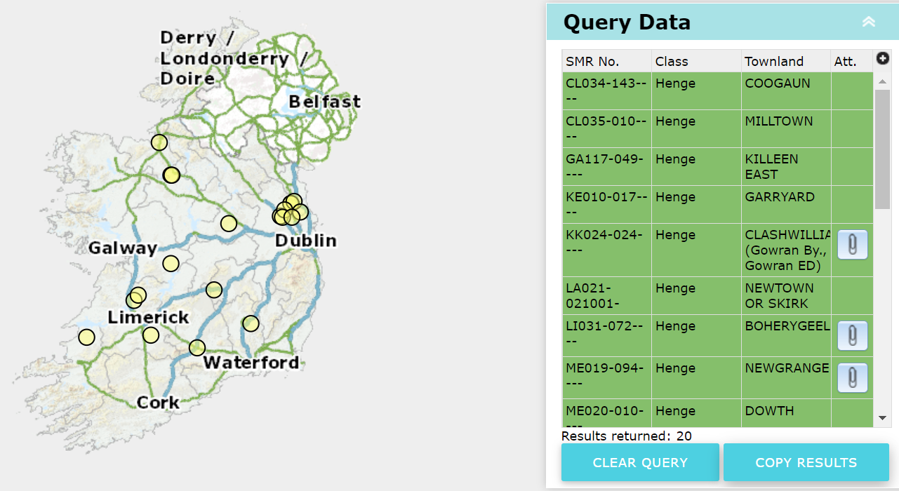 I was a bit surprised. According to ChatGPT, there are no henge monuments in Ireland, they’re a British monument. Rather than judge the little AI as ill-informed, I decided to help it out, as it needs a bit of an education. So I immediately went to the Historic Environment Viewer and queried (“All Counties”, “Class” = ‘Henge’) and got exactly as I expected, 20 henge monuments, officially recorded in the SMR, with a handy little map and a results table.